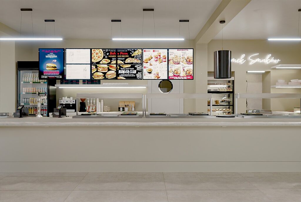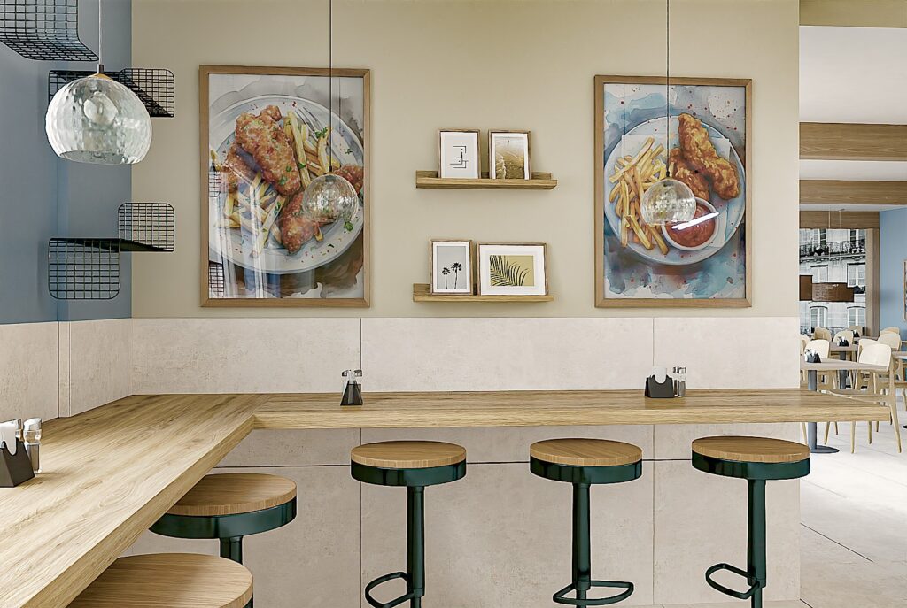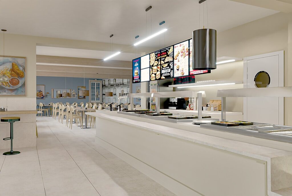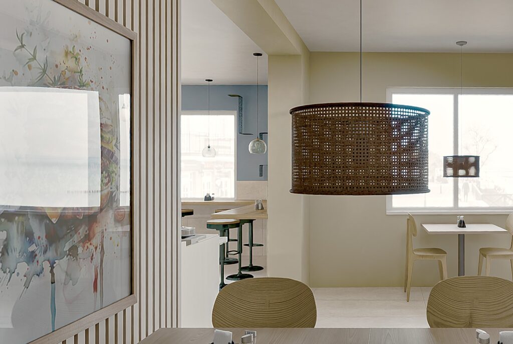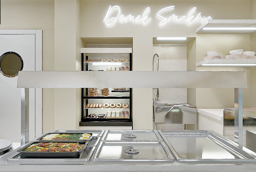 Projekt wnętrza restauracji skupia się na funkcjonalności i wygodzie użytkowania. Układ przestrzeni ułatwia sprawne wydawanie jedzenia na wagę oraz intuicyjne poruszanie się klientów. Czytelna strefa ekspozycji potraw, odpowiednie oświetlenie i proste formy mebli wspierają komfort zarówno gości, jak i obsługi.