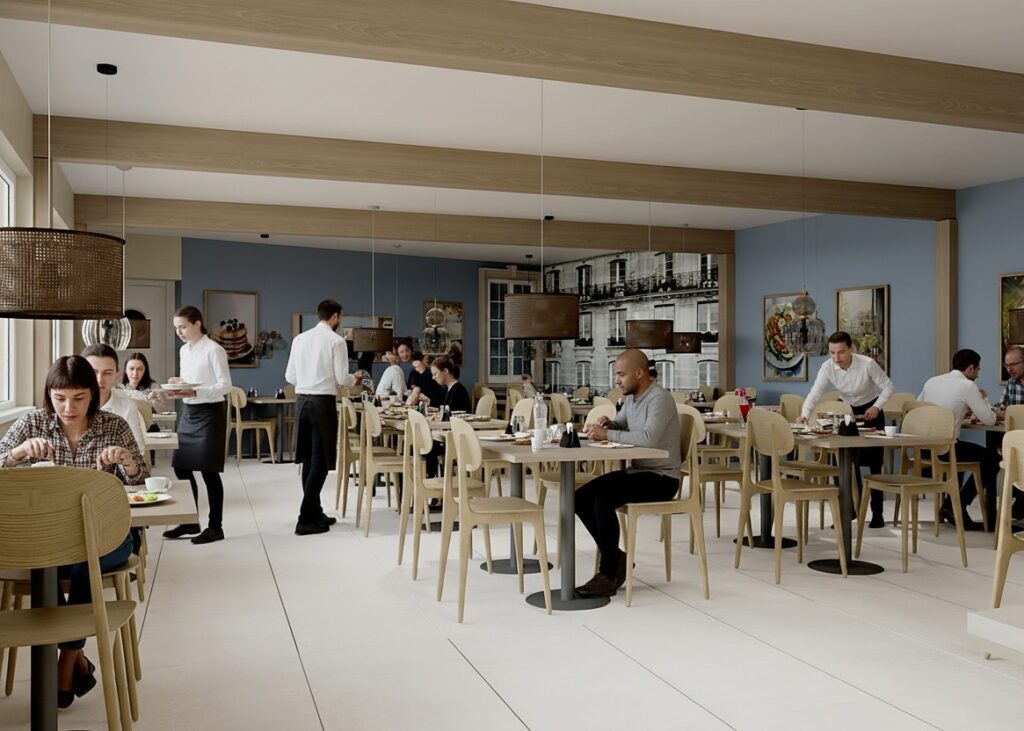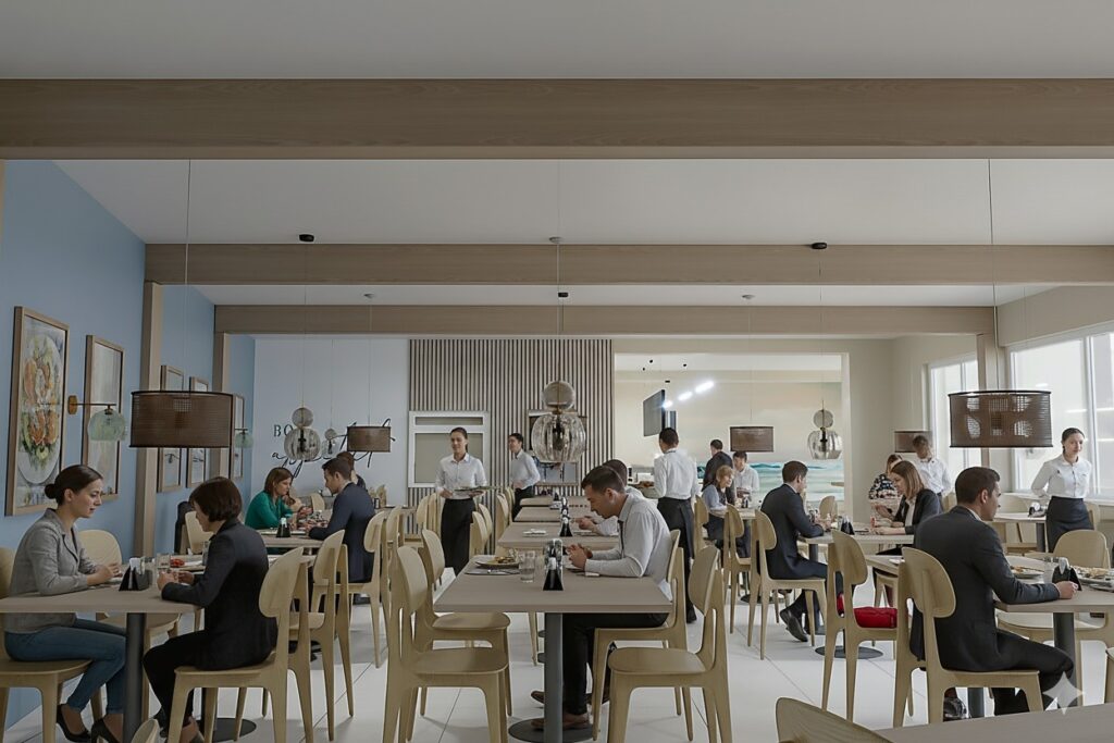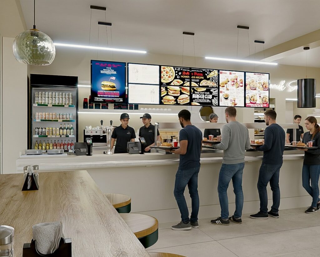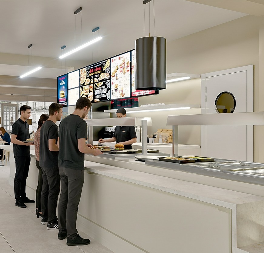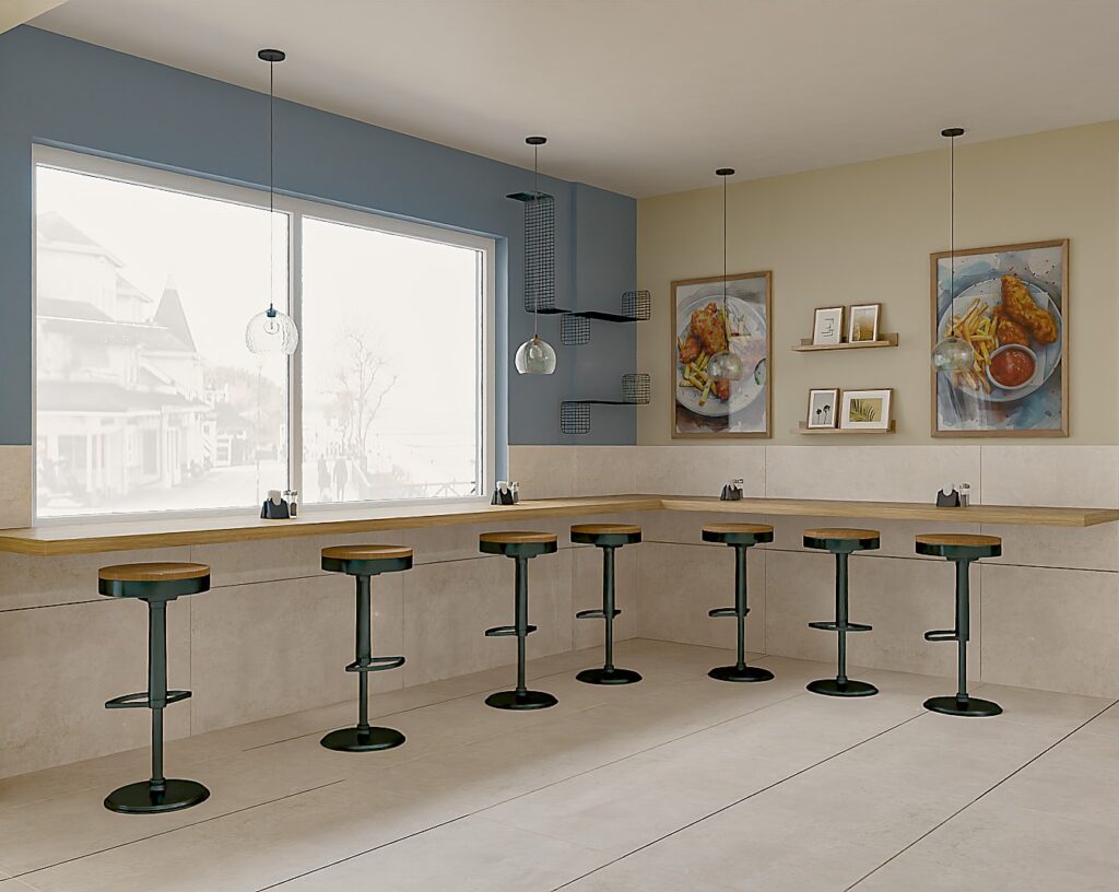 Projekt wnętrza restauracji skupia się na funkcjonalności i wygodzie użytkowania. Układ przestrzeni ułatwia sprawne wydawanie jedzenia na wagę oraz intuicyjne poruszanie się klientów. Czytelna strefa ekspozycji potraw, odpowiednie oświetlenie i proste formy mebli wspierają komfort zarówno gości, jak i obsługi.